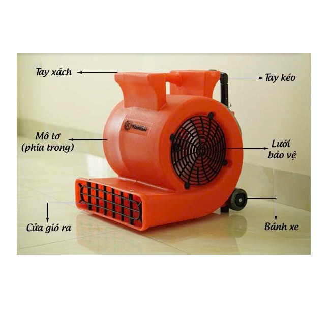 - Luồng gió mạnh mẽ và tập trung: Thiết kế ống ra gió dạng dẹt nằm sát mặt đất giúp luồng gió tập trung tối đa vào bề mặt cần làm khô (thảm, sàn, tường...), đẩy nhanh quá trình sấy.